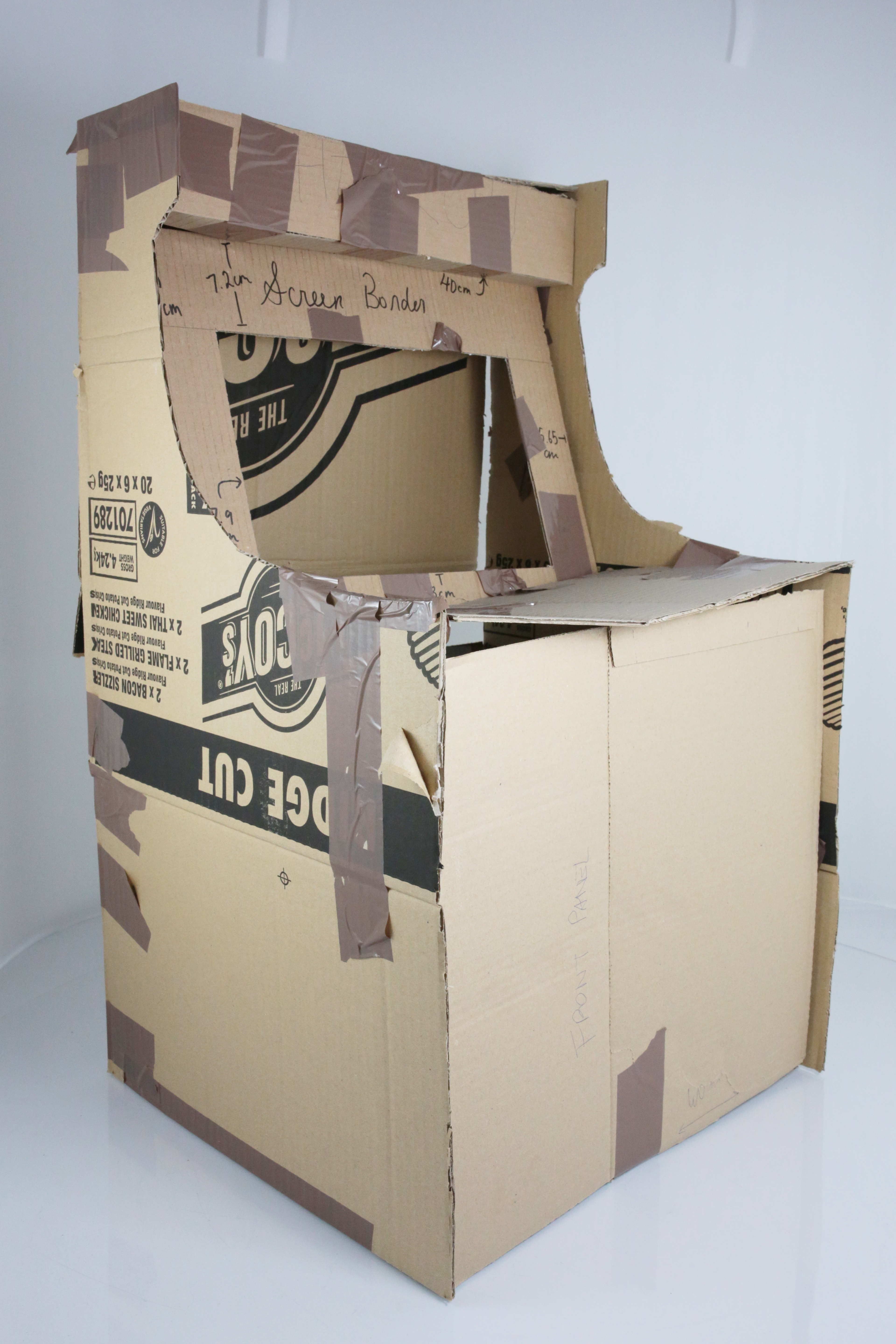 Two tiny cardboard mock ups for design, one large life-sized one for prototyping, first arcade iteration (binned) and final product: before after ︎︎︎